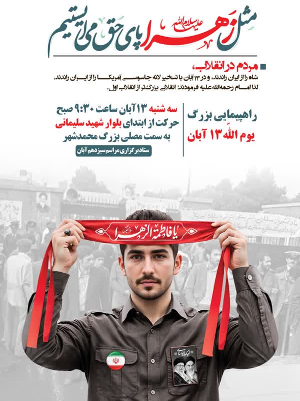 🇮🇷 راهپیمایی بزرگ سیزده آبان 🔸با حضور دانش آموزان، دانشجویان و مردم ولایت مدار محمدشهر 🗓 سه شنبه ۱۳ آبان ماه، ساعت ۹:۳۰صبح 📌 از ابتدای بلوار شهید سلیمانی به سمت مصلای بزرگ محمدشهر 🔰 رسانه ای برای مردم محمدشهر و ماهدشت